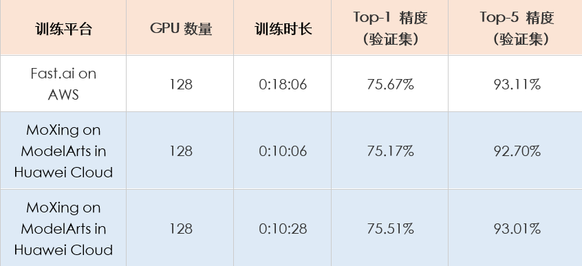 采用与fast.ai一样的硬件、模型和训练数据,ModelArts可将训练时长可缩短到10分钟,创造了新的纪录,为用户节省44%的时间