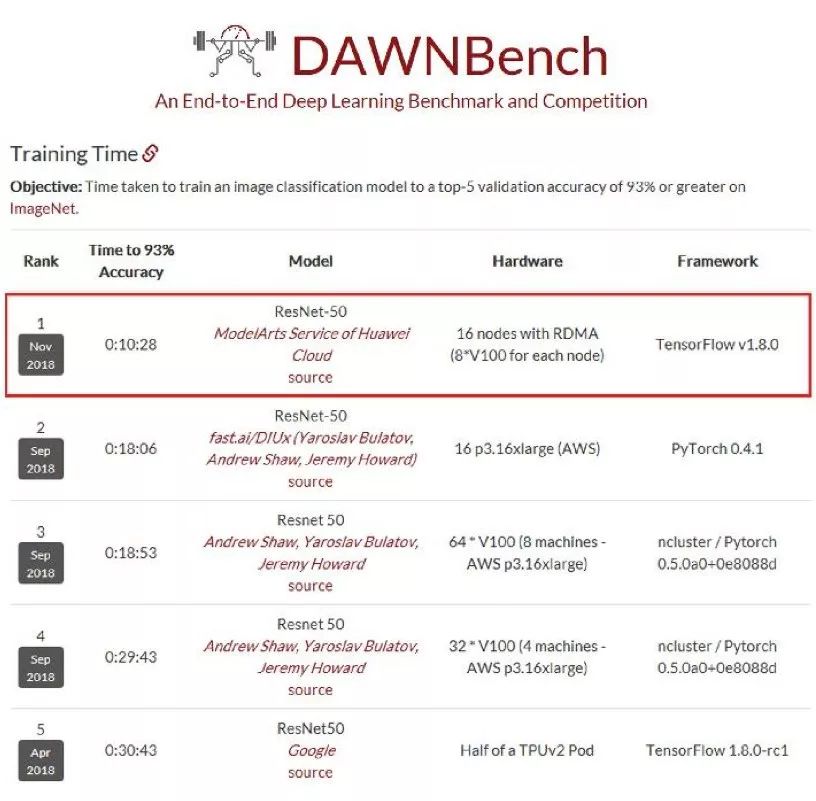 斯坦福大学DAWNBenchmark图像识别训练时间最新成绩,华为云ModelArts以10分28秒排名第一,超越了fast.ai、谷歌等劲敌。来源:dawn.cs.stanford.edu/benchmark/