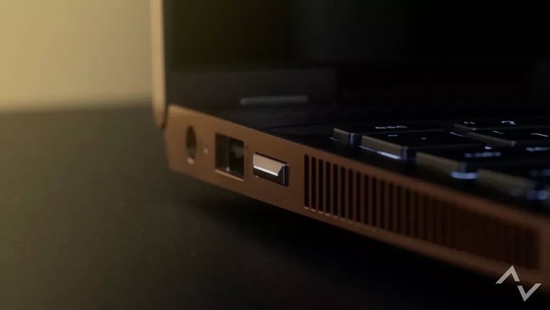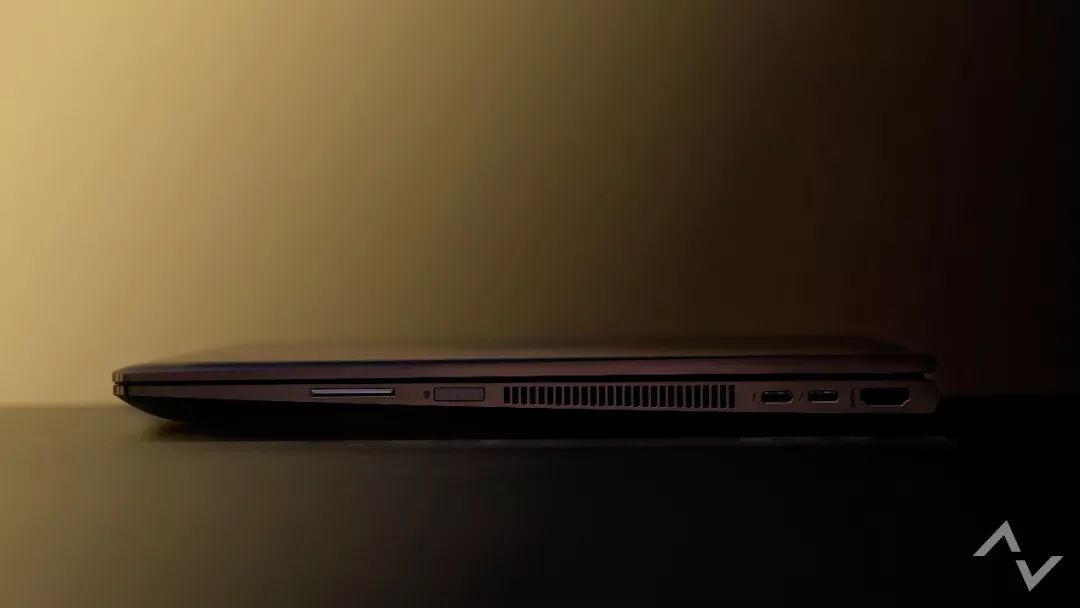 机身右侧分别是音量按钮,指纹识别传感器,散热口,两个支持雷电的 Type-C 接口和一个 HDMI 接口。在如此轻薄的机身下,惠普仍然提供了丰富的接口,尽可能地满足用户在不同场合的扩展性需要。