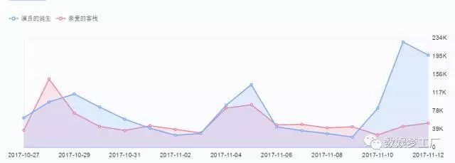 微博指数(蓝线为《演员的诞生》,红线为《亲爱·的客栈》)