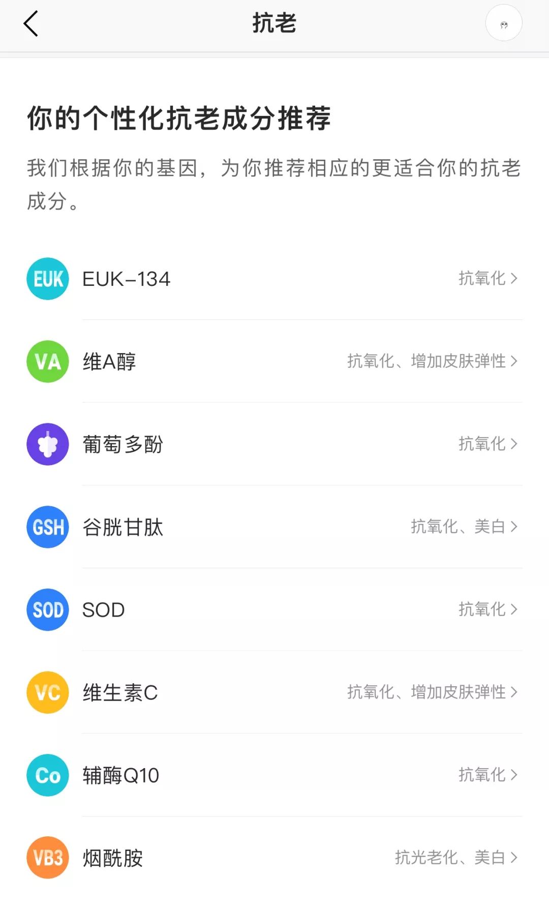 例如在波波非常在意的“皮肤管理”里,就显示出她的“皮肤弹性强”,而且还贴心的推荐了跟她基因匹配的护肤成分,根据科学修炼成天山童姥指日可待!