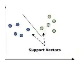 在上图中,我们有两个特征,因此我们首先需要在二维空间中绘制这两个变量,其中每个点有两个坐标,称为支持向量。该行将数据拆分为两个不同的分类组。这一行是分类器。