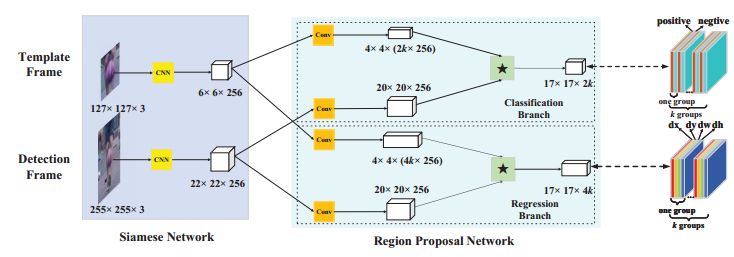 推荐理由: 商汤在CVPR2018的SiamRPN是对SiamFC的一个重要改进。SiamFC存在的一个本质问题是无法进行尺度估计,而跟踪中随着时间的变化目标大小形状一直在变化。为了解决这个问题,SiamRPN在SiamFC的基础上增加了一个用于回归目标大小的head,可以将其看成是一个onestage的特定目标检测。速度快,精度高。