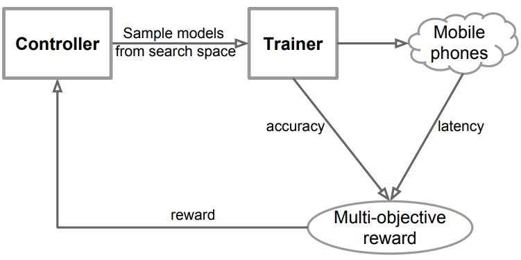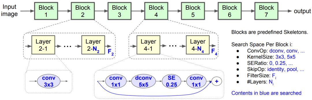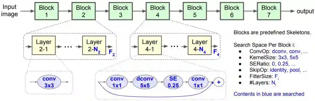 推荐理由:该工作由Google产出,被收录于CVPR2019. 该方法的两大创新点被后续NAS工作广泛采纳,在NAS领域也具有重要作用。第一,Mnas提出直接在搜索过程中优化目标硬件上网络结构的latency,通过多目标优化的方法基于RL取得了优秀的结果。第二,Mnas提出基于MobileNet的级联block的搜索空间,摒弃了之前基于Cell拓扑结构复杂的搜索空间,Mnas的搜索空间在latency上更为友好,并在精度上也有很大的优势,该搜索空间被后来工作广泛应用。