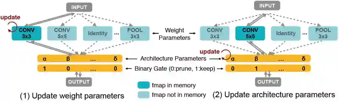 推荐理由:该工作由MIT Song Han实验室产出,被收录于ICLR2019. 本工作还是以减少搜索代价为出发点,对NAS算法进行改进。虽然Differentiable NAS的方法可以极大缩短搜索时间,但是由于其搜索空间由一个连续可微超大网络的表示,传统的Differentiable NAS方法需要占用较多的GPU显存。ProxylessNAS的方法在于优化super network的参数每次只通过一条或部分路径,从而极大减少了显存占用。该工作还针对硬件优化结构,获得了非常优秀的结果。