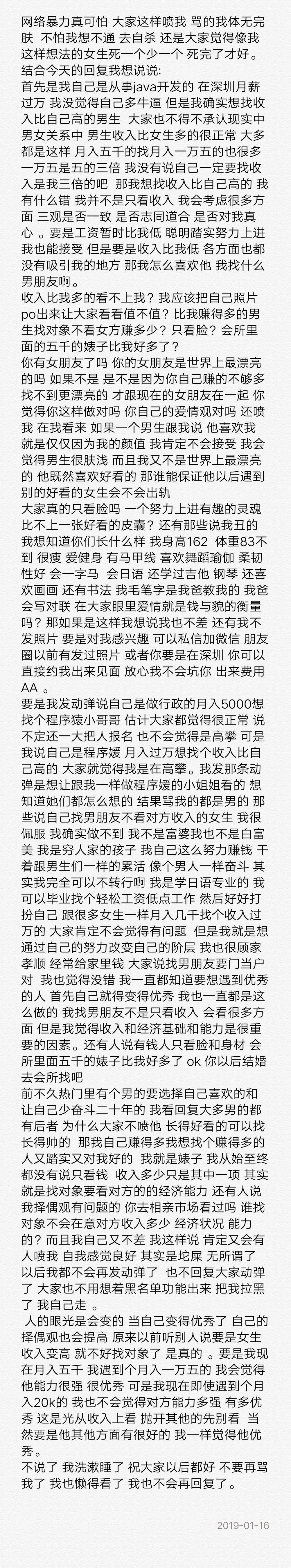 @秃头程序媛 :感觉大家有点儿把热门那个小姐姐逼急了......一开始还只是淡定回复,现在都逼急了....隔着屏幕打字真的很可怕!我觉得她只是人生阅历不够丰富,才会有这样的想法,大家理性评论就好了,不要披头上去就是喷QwQ