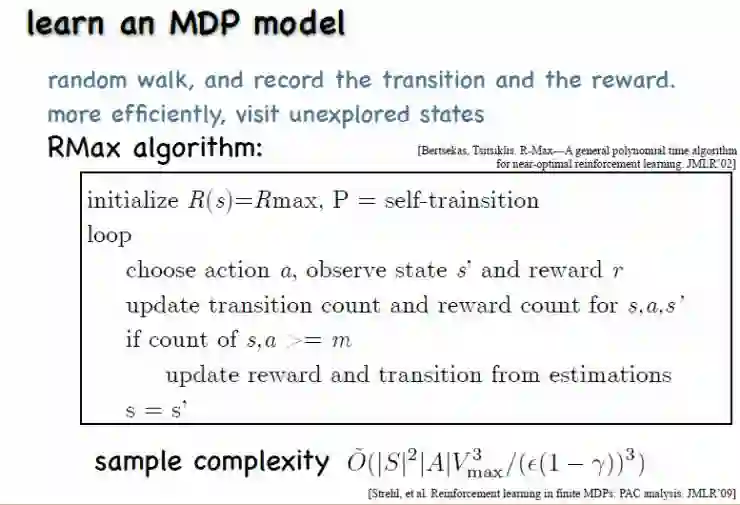 虽然看起来很简单,但是还原MDP的样本复杂度是状态数的平方,远高于前面说到的求解策略的复杂度。从这里可以看出学习MDP的复杂度极高,所以大量的研究工作都集中在免模型学习上。