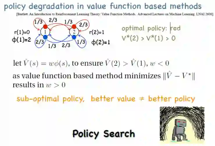 但是基于值函数的做法是要使得V值尽量靠近最优的V值,最优的V值又是正值,这样会导致这个W一定是正的,无法得到最优的策略。这样值函数估计得越准,策略越差的现象被称为策略退化。