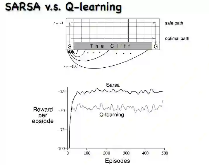 在这里用On Policy SARSA会有一定的概率去探索,也就有可能会掉到这个悬崖下面去,所以奖赏就会比较小;而用Q Learning,因为最后的策略是不带任何探索的,没有任何的随机性,所以路径最短。