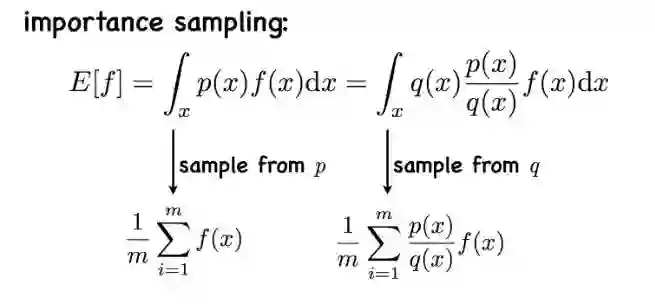 但很多时候,我们想学的实际是不带探索的策略,也就是说要从带探索的策略中采样,但更新的只是策略本身,即Off Policy。这里面临一个问题就是,采样并不来自于当前的策略,常用的重要性采样(Importance Sampling)技术通过修改采样的分布,改成想要的样子。可以通过加权重这个简单的方法,修改策略的分布,然把这个分布加到具体算法里面去。也就是把奖赏加了一个权重,这样的算法就变成一个Off Policy的算法,这样它学习的就是π自己了。