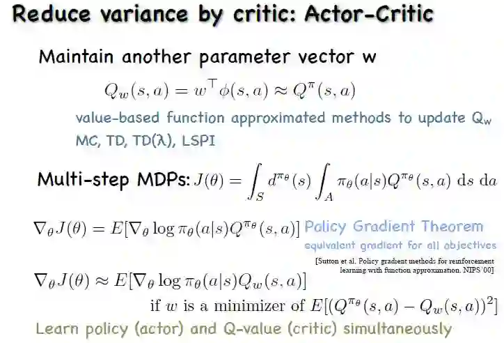 控制方差有多种方式,其中一种叫做Actor-Critic。用比如直接求导的方式把策略求出来,叫做Actor;对值函数进行估计,并用于评估策略,是Critic,意为它是一个评价者。