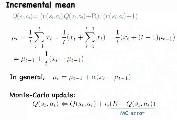 更新均值还可以写成:μt = μt-1 + α(xt _ μt-1),意思是刚才我们更新的是Q值(算式如下图显示),其中R − Q(st, at)叫做蒙特卡罗误差。我们知道,Q是对奖赏的一个估计,R是是采完这个轨迹以后得到的真实的奖赏。换句话说,Q值d饿更新就是加上就是真实值和估计值的差别,即蒙特卡罗误差。