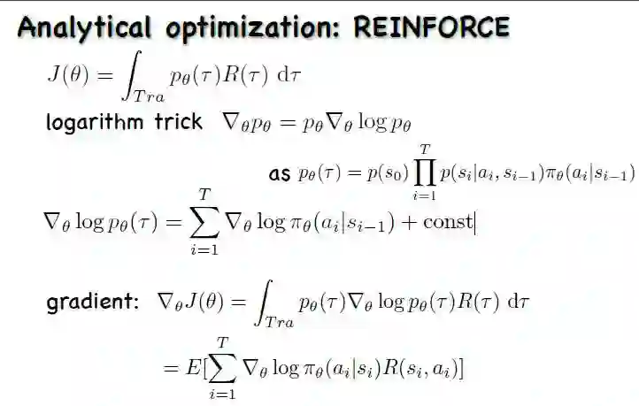 还有对策略直接求导的方法,比如无梯度的优化(Derivative-Free Optimization)。这类方法不管强化学习是在做什么,而是直接优化策略里面的参数。优化完参数以后,试一下策略,得出这个值具体是多少。