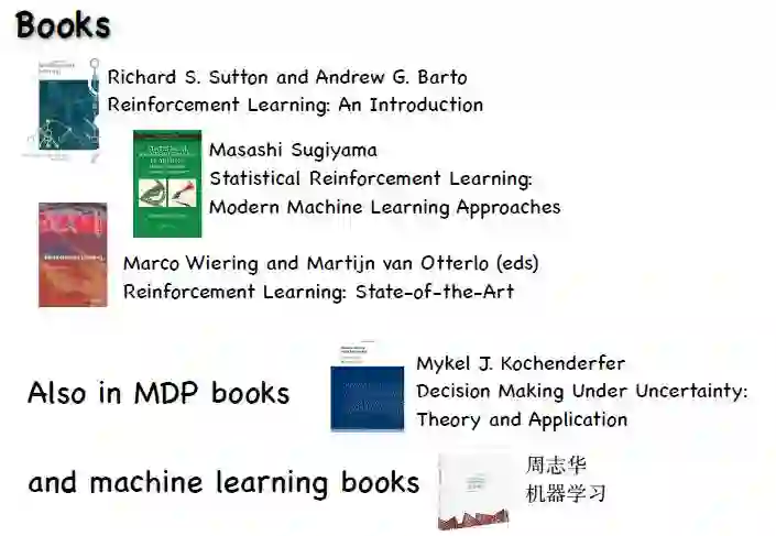 强化学习的书不多,最经典的书是Richard S. Sutton的教科书;Masashi Sugiyama的书属于专著;Reinforcement Learning: State-of-the-Art属于文集,覆盖面比较广,但需要读者有一定基础;还有一些讲述MDP的书;另外,在机器学习的书里面也会提到强化学习。