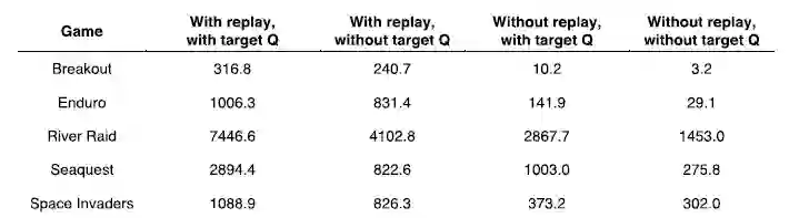 这里面,“with replay”和“without replay”的意思是有没有用到历史数据,“with target Q”和“without target Q”就用了CNN还是线性网络。我们可以看到,神经网络在这里贡献并不是最大的。如果我们只用神经网络而不用replay的话,效果还不如用了replay,但只用线性模型而不用CNN。当然,同时使用深度模型和强化学习是最好的,这可以完成一些过去完成不了的事情。