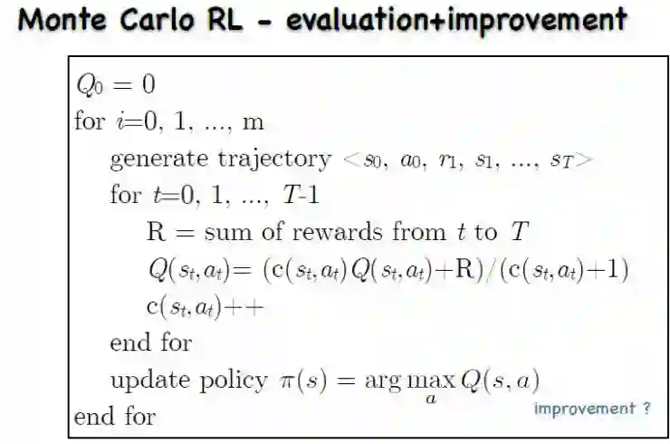整个算法写出来比较简单。我们要做m次采样,每一次都把当前的策略拿到环境里面运行,然后会得到一个序列,根据序列让奖赏求和,然后更新Q值,这个Q值就是历史上采样的均值,c是计数。