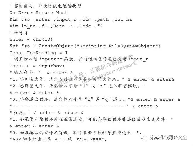 这段代码的意思就是将变量Data里的内容全部转换为ASCII码,那么它如何运行呢?可以新建一个文本文档,在里面输入相应代码后,再将其.txt后缀名更改为.vbs即可。当然了,仅凭以上那一小段代码还是运行不起来的。为此编写了一个加密程序,并在关键的地方为大家进行了相应的解释,方便大家的学习和使用,代码如下: