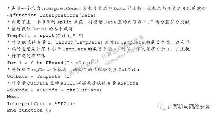 首先变量Msg里包含了一个加密的可执行ASP语句response.write("Hi!this is a Backdoor.ASP.Ace.cm!"),它的作用就是打印"Hi!this is a Backdoor.ASP.Ace.cm!"这个句子,但是我们发现源程序中的句子已经被做了处理,其中被随意插入了许多“@”号,我们就当它是已经加密的木马文件。利用Split函数将变量Msg里加密的ASP语句以“@”号为分隔符分别存入数组data里,由于已加密的ASP语句里有6个“@”,因此它们被当成了7个不同的成员保存在数组data里。接下来就是以一个for循环语句解密,循环条件里的变量i被设为数组的下标,用来代表数组里的不同成员,后面的ubound(data)则返回数组data的成员个数,并且每执行一次,i的值就加1。循环体的内容是将数组data里下标为i的成员里的数据附加给变量temp,假设原来temp里的内容为resp,且下标为1的成员里的内容为onse.writ,那么执行完毕后temp的内容便为response.writ了。由此不难看出,这个循环语句的作用就是将数组里的所有成员所保存的内容都一一“吐”给变量temp。