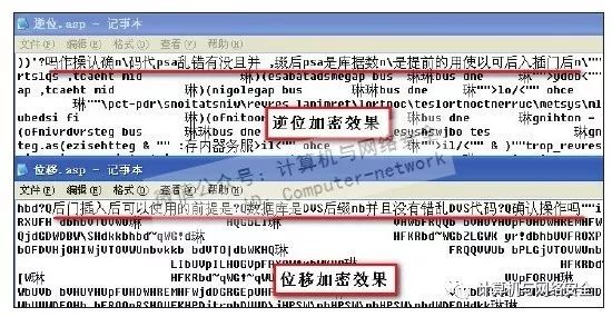 我们先来看看这两种方法的加密效果,如图6所示。通过此图可以看出,所谓的逆位法就是将脚本木马的代码都倒过来,而位移法则是使字母变成另外一个可显示的符号,汉字并没有变化。所以相对来说还是逆位法的加密效果比较好。