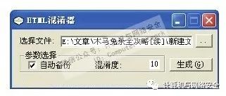 打开HTML混淆器后单击"……"按钮选择要加密的HTML文件,如图10所示。其中“混淆度”使用默认的10即可,然后单击“生成”按钮就可以完成加密了。如果加密后没有达到免杀的效果,还可以进行第二次加密,直到不被查杀为止。
