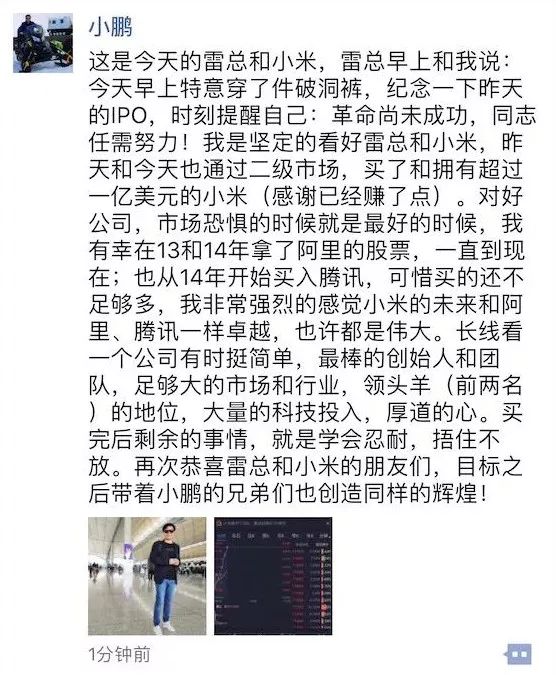 36氪讯,小鹏汽车董事长何小鹏在朋友圈表示:坚定的看好雷总和小米,也通过二级市场,买了和拥有超过1亿美元的小米(股票)。下单前并未与雷军做任何沟通,下单后告诉了小米的某位员工,后者转述给了雷军。雷军还特意对何小鹏表示了谢意。买入小米,除了和雷军是好友关系,彼此在需要的时候互相帮忙外,主要还是因为看好小米的未来。