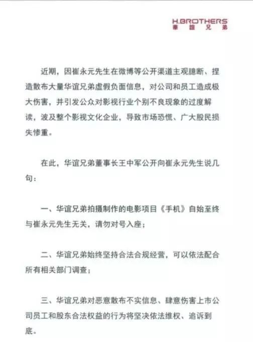 36氪讯,华谊兄弟发布公告称:对恶意散布不实信息、肆意伤害上市公司员工和股东合法权益的行为将坚决依法维权、追诉到底。