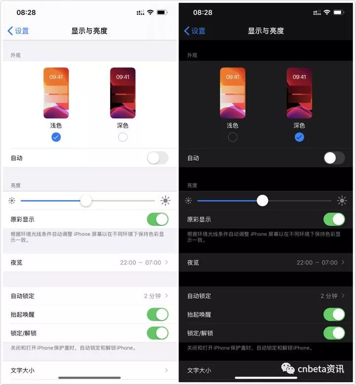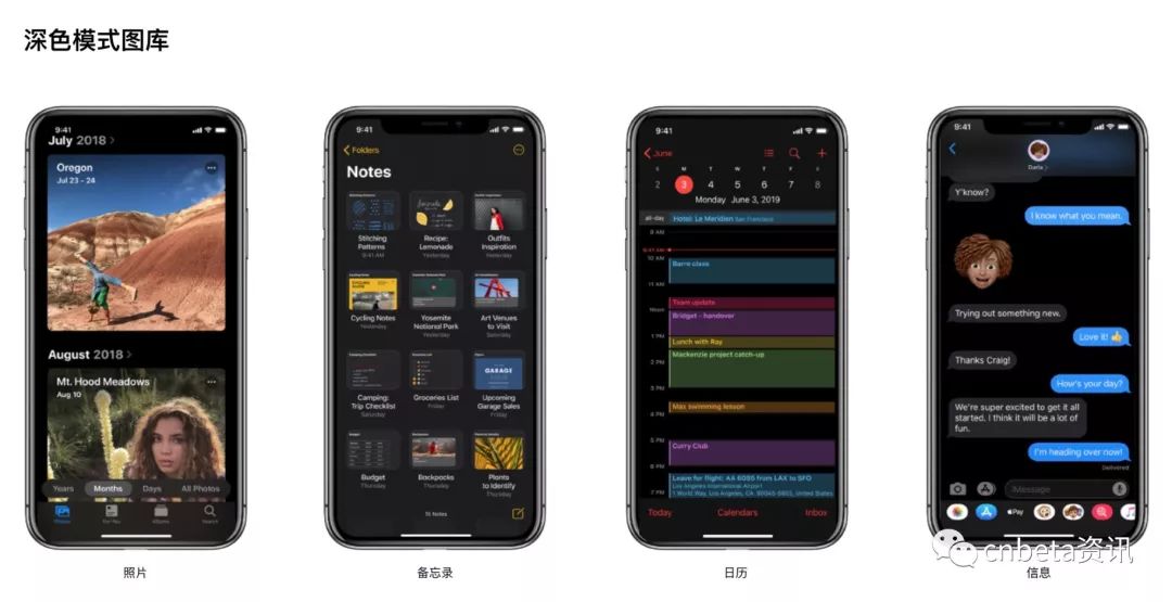 毫无疑问,更新到 iOS 13 公测版后你首先看到的就是深色模式。深色模式与 iOS 系统全面整合,系统界面、系统程序页、键盘、Animoji 背景都会呈黑色底色显示。深色模式可以在“设置-显示”中开启,也可以在控制中心快速开启或关闭,另外,你还可以将深色模式设置为在特定的时间或根据日出和日落来开启和关闭。