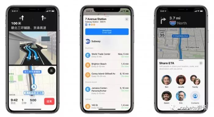 苹果地图更新了包括路口视图、实时公交、常用地点、收藏、分享 ETA 等功能,全新的地图经过彻底重新打造,道路、海滩、公园和建筑物等元素的细节显著提升、更加真实生动。在抵达目的地前,以身临其境的三维视角先行探索,360 度全方位欣赏你要去的地方。虽然有一部分国内无法体验到,但没关系,新的地图现在有支持国行版的路口视图功能,这个在车辆转弯或进入高架道路前,通过行车线引导驾驶者驶入正确的车道,非常有用。