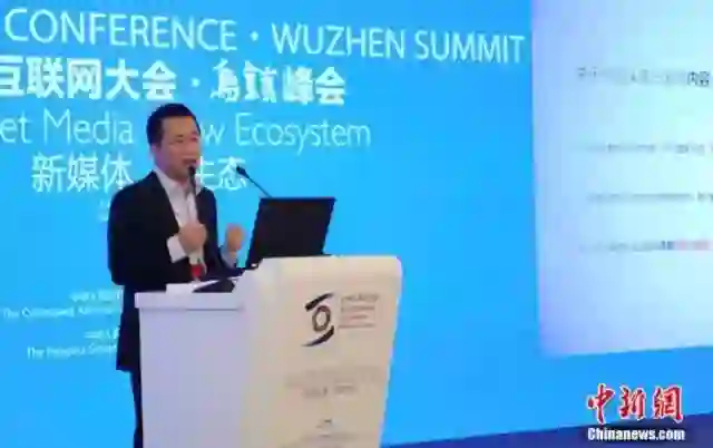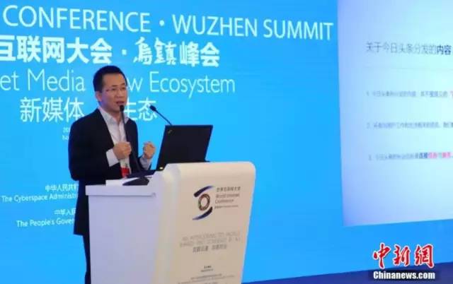 2014年11月,乌镇,首届互联网大会召开,张一鸣登台发表演讲(图片来自中新社报道)。