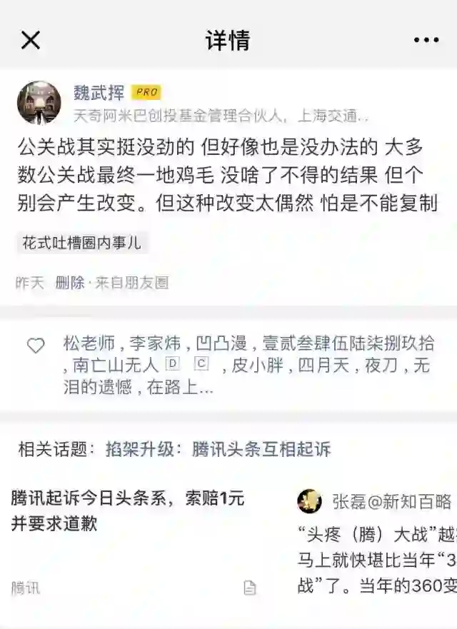 一方主将依然,说的就是今日头条公关线最高负责人李亮,曾是当年3Q大战时360这方的公关主将。一方旗帜未变,当然是说腾讯。主将嘛,肯定是变了。