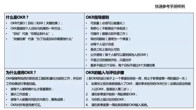 首先,西尔斯为这些业务经理提供了多种多样的OKR培训。培训团队制作了许多关于OKR的短视频,用于介绍OKR的相关知识,经理们只需在网站上花费几分钟的时间,就能了解OKR是一种怎样的管理工具,以及西尔斯为什么要使用它。此外,培训团队还制作了OKR参考指南(下图)