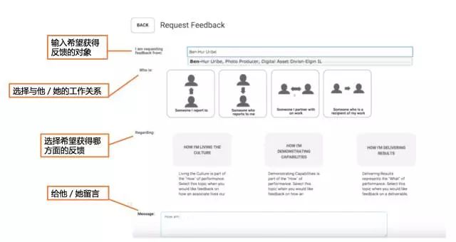 当业务经理希望知晓其他人对自己工作的看法时,他们只需进入操作平台,在反馈页面选择希望获得从谁那里获得反馈以及希望听取哪方面的建议,这个请求就会发送给对方。在对方做出评价后,便能在系统中查询到具体的反馈意见。