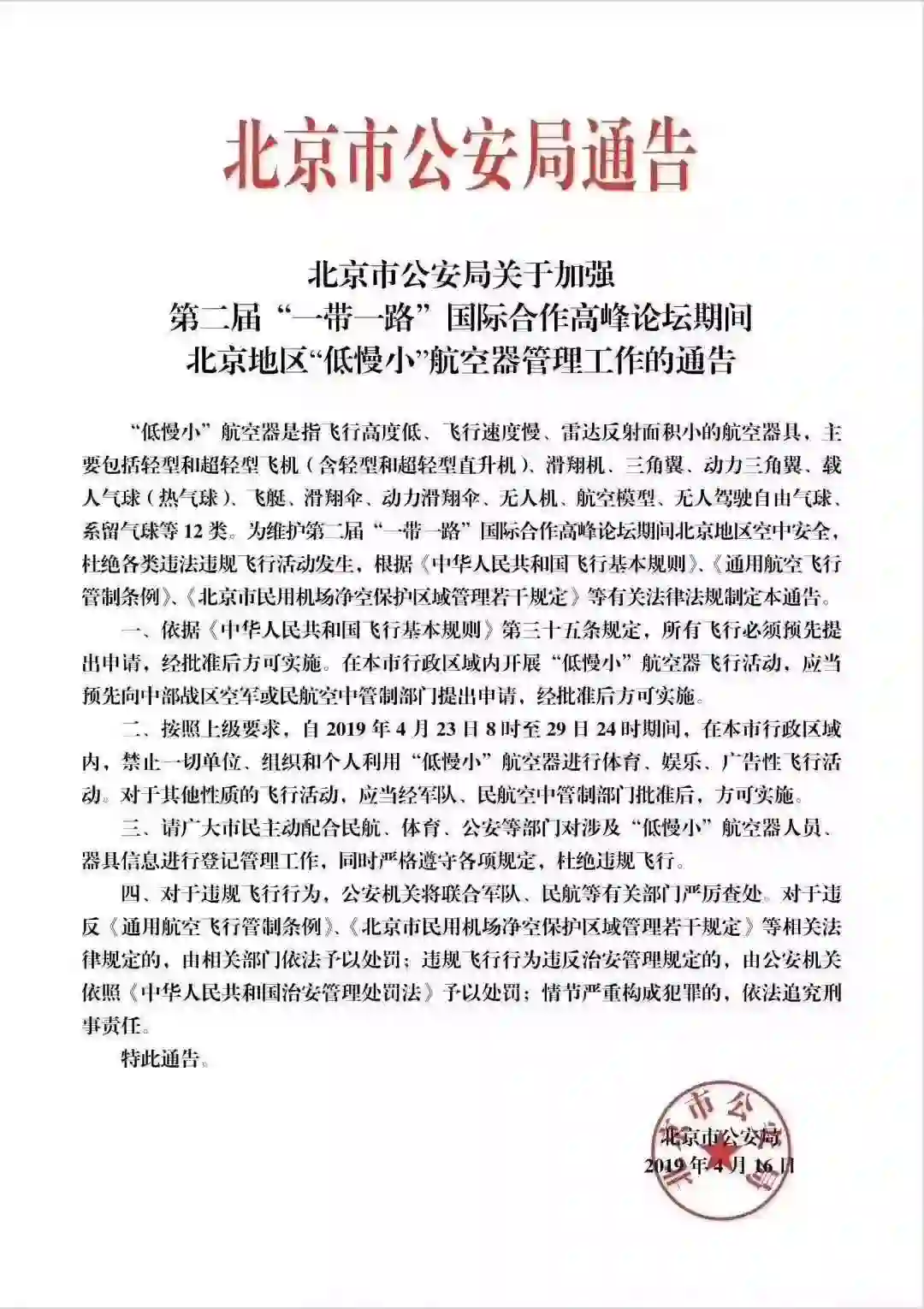2019年4月16日,北京市公安局发布“关于加强第二届‘一带一路‘国际合作高峰论坛期间北京地区‘低慢小’航空器管理工作的通告”。