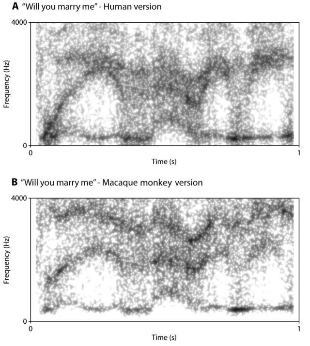 Ghazanfar实验室进行比对实验时用的“Will you marry me?”音频。第一个是人类女性的声音,第二个是电脑模拟猕猴发出的声音。两段音频用相同的噪音源进行了技术处理 。音频来源:参考文献[4]