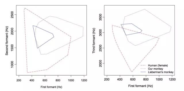 人类说话或唱歌产生的声音包含许多不同的频率,共振峰(即发出声音时可以被作为特征识别的关键频率)是使听者能够区分元音的关键泛音[8]。Ghazanfar实验室的研究结果显示,猕猴的发音空间并不像Lieberman 五十年前用石膏模型预测出的结果那么悲观,猕猴的元音共振峰空间图谱倒是与人类女性有很大一部分重叠。