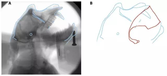 Ghazanfar实验室提取出的声道构象之一。A: 一只正在发出威胁性吼叫的猕猴的X光图。B: 轮廓提取。红线为声道轮廓。 图片来源: 参考文献[4]