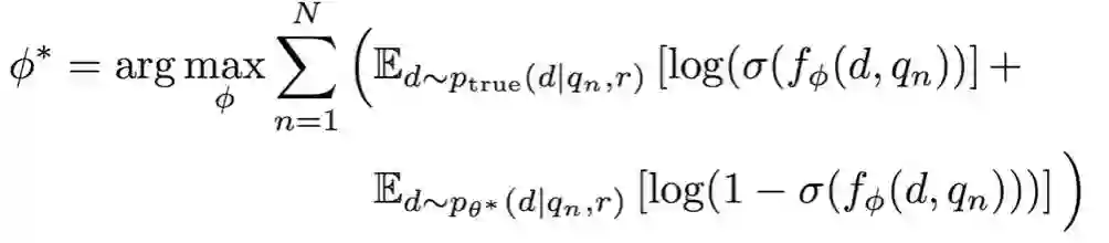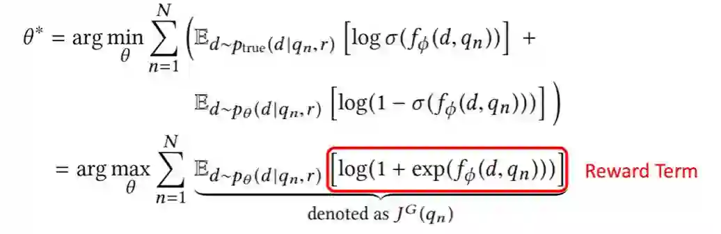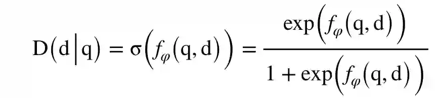 1. Discriminator: ,其中,φ 是 D 的参数。D 的输入时 Query-Document 对数据(q,d),而输出则是这对数据是否匹配。这相当于一个二分类问题,可以通过 logistic regression 给出: