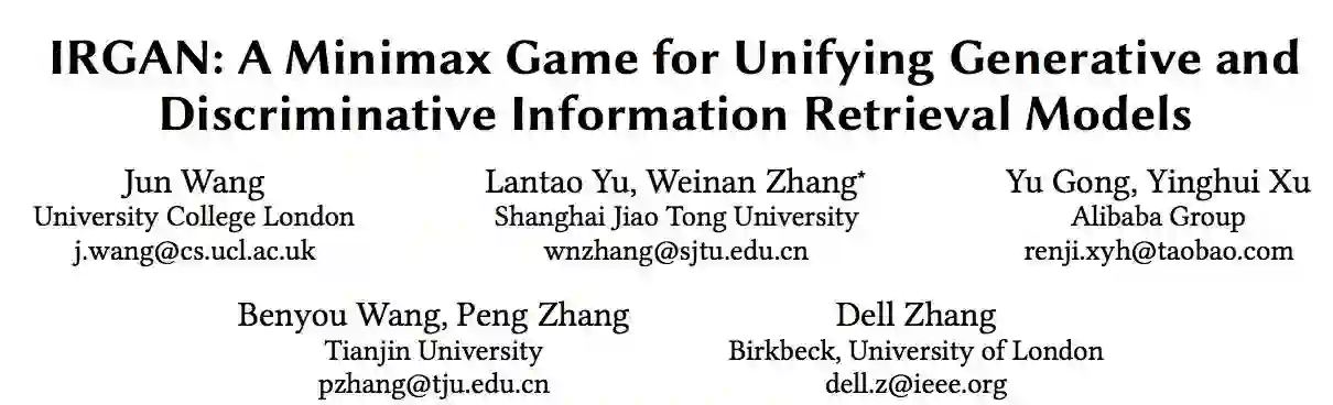 应用 GAN 的思想,IRGAN 引入博弈论中的 minmax 博弈,来将生成式 IR 模型和判别式 IR 模型进行结合。具体来说,我们为两个模型定义一个共同的检索函数(例如基于判别的目标函数)。一方面,判别模型 旨在通过从标记数据中学习来最大化目标函数,并为生成模型提供训练的指导性信息。另一方面,生成模型