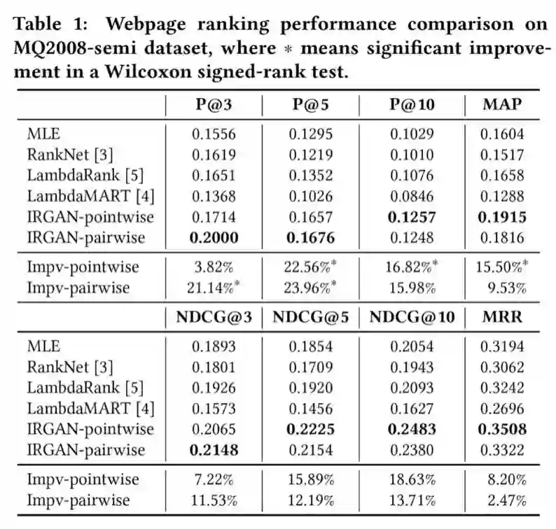 在实验部分,做了三个不同的 IR 任务:Web Search,Item Recommendation 和 Question Answering,实验结果表明,IRGAN 模型打败了多种 strong baseline。开源代码在:https://github.com/geek-ai/irgan。