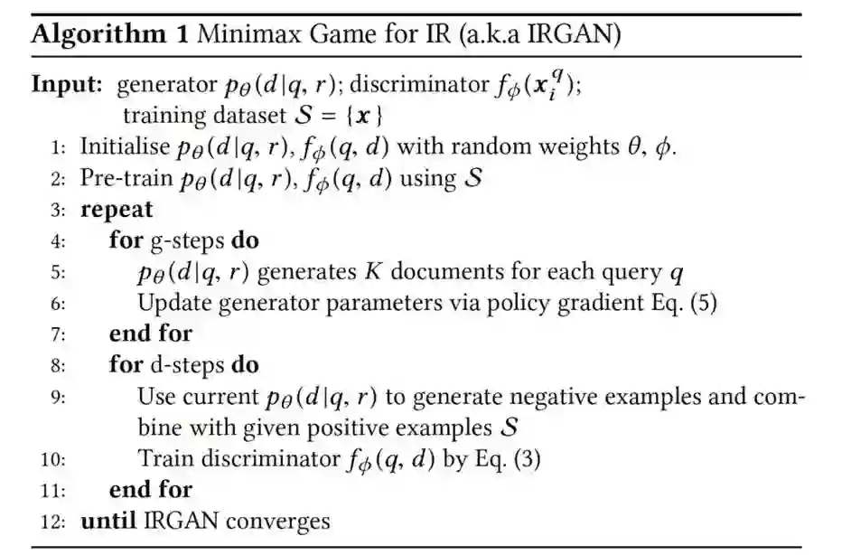 对 IRGAN 的 training 部分,G 和 D 交叉进行更新。对于 D,可以采用梯度下降更新法;对于 G,由于 G 的输出是离散 documents 的概率分布,没办法直接采用梯度下降的方法求 G 的梯度,针对这种使用 GAN 训练离散数据的问题,可以采用强化学习中 Policy Gradient 的方法,reward 由 D 给出。整个训练过程如下图算法所示: