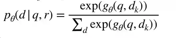 2. Generator: ,其中,θ 是 G 的参数。G 的输入时 Query,输出是与 Query 相关的 documents 的概率分布,相关性即由这个概率分布表示。