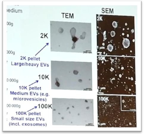 3. 理论上,2k产物应为细胞碎片等,10k应为MV即随机向外释放的大囊泡,100k为30-150nm的外泌体,但实际上,对三组产物进行电镜观察,发现三组互相存在,只是比例有差别而已。这里,阿姨着重提出了电镜观察的重要性,这与之前我们外泌体之家举办的讲座中重点提示的相同,参考高博士当时举的一篇文献,大家可以自行比对自己提取到的外泌体是否是外泌体。笔者在海报区看到一些外泌体TEM图片根本就不是外泌体,而是低密度、高密度脂蛋白,询问了一下基本是沉淀法试剂盒提取的。