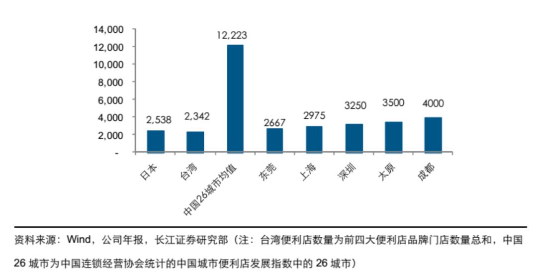 从单店辐射人数来看,国内目前便利店的渗透率的确较低。据中国连锁经营协会统计,国内26个重点城市单个便利店辐射人数为1.2万人,同期日本和台湾这一数值约为2500人。除广东、上海两地便利店密度达到了白热化竞争阶段以外,其他城市便利店市场普遍处在起步和初期成长阶段。