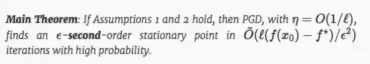 主要定理中,O~(⋅) 只隐藏了对数因子;这边对维度的依赖只有log4(d).。定理证明,在一个额外增加的Hessian-Lipschitz条件下,增加扰动的GD收敛到二阶驻点的时间和GD收敛到一阶驻点的时间几乎是一样的。因此,我们可以得出结论,PGD可以无消耗的逃离鞍点。