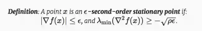 这里 xt 是需优化变量在第t步的值,η 是步长。梯度下降法的理论研究在凸优化上已经很充分了,但是在非凸优化情况下就少了很多。我们知道,在非凸情况下,GD会快速收敛到驻点(附近的点),但是这些稳定的点可能是局部极小点或者是没用的局部最大点或者甚至是鞍点。
