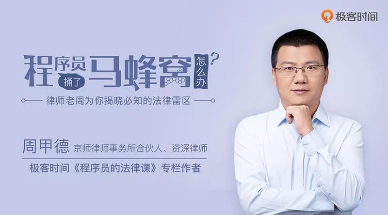 周甲德,毕业于中国政法大学,是北京市京师律师事务所的合伙人、资深律师,合同风控法律事务部主任,极客时间《程序员的法律课》专栏作者。他曾多次接受中央电视台、中央广播电台、北京广播电台、《法制晚报》等媒体采访,同时也是中国交通广播 《一呼百应帮帮忙》栏目的特邀嘉宾。