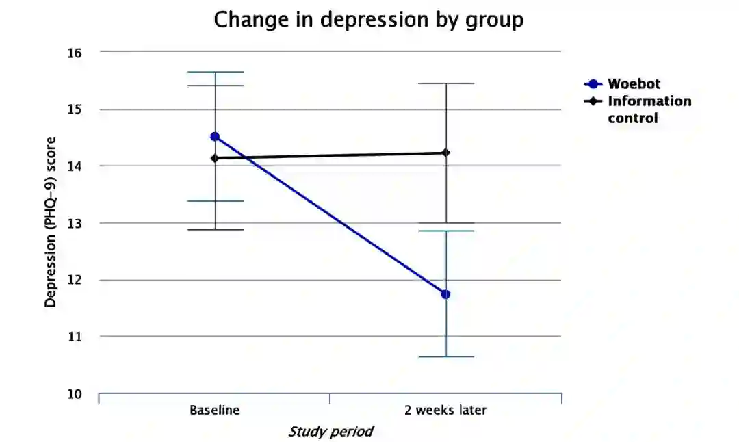 他们从大学社交媒体网站上招募了 70 名 18 至 28 岁的自述抑郁或焦虑的人。 参与者分成两组,一组的成员与Woebot 交谈了 20 次或超过两周的时间,另一组成员获得了国家精神卫生研究所的电子书《抑郁症和大学生》( Depression and College Students)。在试验前后进行了三次心理健康测试。 研究结果显示,两周后,Woebot 组的抑郁症状明显减轻。