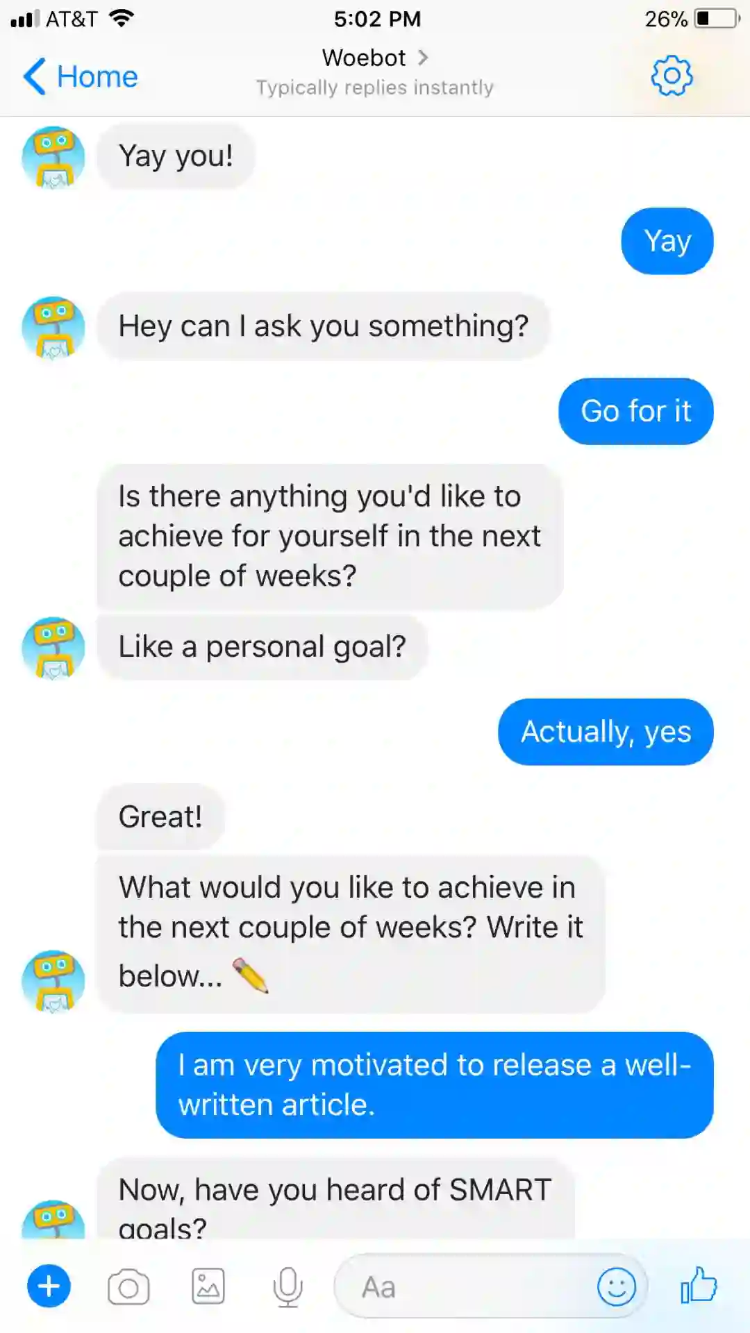「Yay you!」这是 Woebot 和我打招呼的开场白。