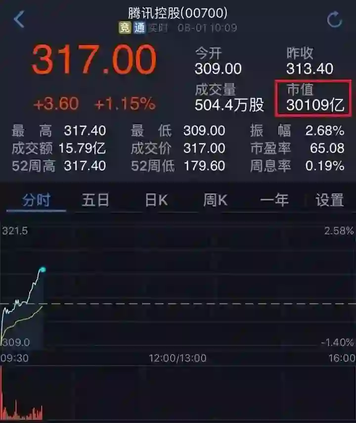 2017年8月1日,腾讯控股总股本94.98亿股,股价达到315.86元,就突破3万亿元。