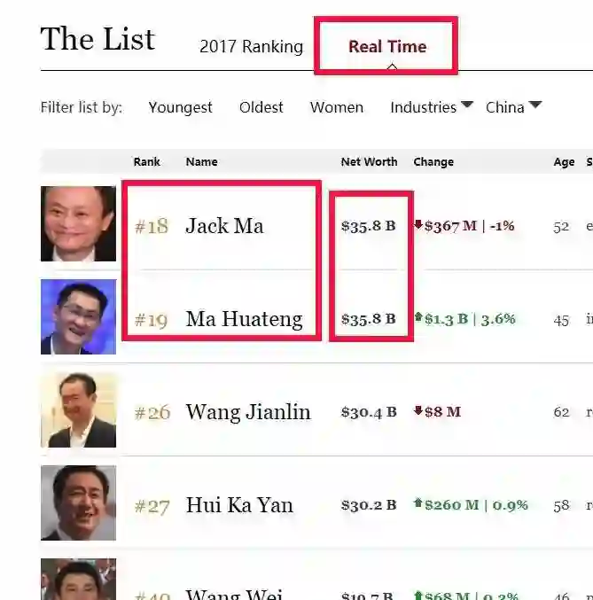 根据福布斯排行榜最新数据,马云的身价为358亿美元,折合人民币2413.92亿元。而随着今天腾讯股价的再度大涨,马化腾的身价已经赶上并一度超越马云,也达到了358亿美元。